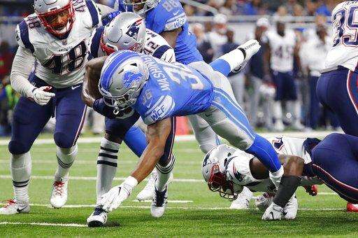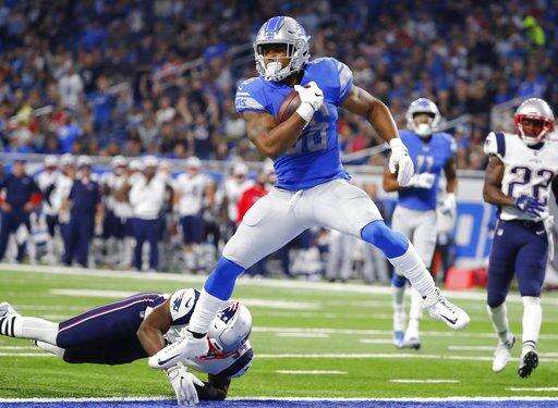 Detroit Lions running back Dwayne Washington (36) leaps into the end zone for an 18-yard rushing touchdown during the second half of an NFL preseason football game against the New England Patriots, Friday, Aug. 25, 2017, in Detroit. (AP Photo/Rick Osentoski) The Associated Press