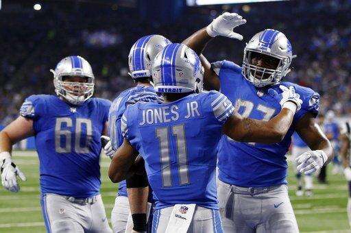 Detroit Lions wide receiver Marvin Jones (11) is congratulated after his 23-yard touchdown reception during the first half of an NFL preseason football game against the New England Patriots, Friday, Aug. 25, 2017, in Detroit. (AP Photo/Duane Burleson) The Associated Press