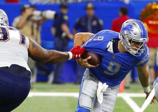 Detroit Lions quarterback Matthew Stafford (9) is sacked by New England Patriots defensive end Alan Branch (97) during the second half of an NFL preseason football game, Friday, Aug. 25, 2017, in Detroit. (AP Photo/Rick Osentoski) The Associated Press