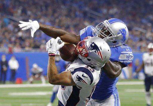 New England Patriots wide receiver Chris Hogan (15), defended by Detroit Lions cornerback Nevin Lawson (24), pulls in a 32-yard pass for a touchdown during the first half of an NFL preseason football game, Friday, Aug. 25, 2017, in Detroit. (AP Photo/Carlos Osorio) The Associated Press