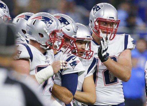 New England Patriots kicker Stephen Gostkowski, second from right, is congratulated after kicking a field goal late in the second half of an NFL preseason football game against the Detroit Lions, Friday, Aug. 25, 2017, in Detroit. The Patriots defeated the Lions 30-28. (AP Photo/Duane Burleson) The Associated Press