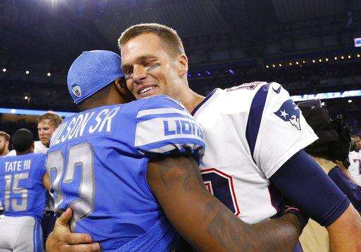 New England Patriots quarterback Tom Brady, right, hugs Detroit Lions strong safety Tavon Wilson (32) after an NFL preseason football game, Friday, Aug. 25, 2017, in Detroit. (AP Photo/Rick Osentoski) The Associated Press