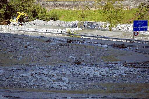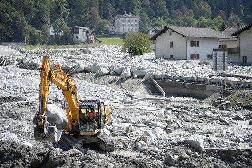 An excavator works on the mudslide in Bondo, Graubuenden in southern Switzerland, Friday, Aug. 25, 2017. Police in eastern Switzerland says some residents of the village pummeled by a rocky mudslide have been authorized to return home, as searchers resumed the hunt for eight missing people. (Gian Ehrenzeller/Keystone via AP)