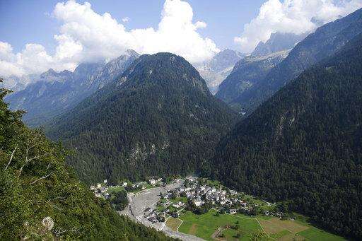 Local residents drive back to Bondo in Graubuenden in southern Switzerland, Friday, Aug. 25, 2017. Police in eastern Switzerland says some residents of the village pummeled by a rocky mudslide have been authorized to return home, as searchers resumed the hunt for eight missing people. (Gian Ehrenzeller/Keystone via AP)