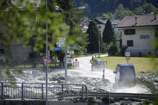 A rocky mudslide rushes towards the village of Bondo, Graubuenden in southern Switzerland, Friday, Aug. 25, 2017, after it was already hit by one on Wednesday. (Gian Ehrenzeller/Keystone via AP)