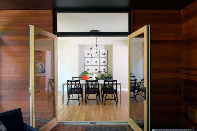Inside the porch, the walls are clad in stained cedar like the exterior of the addition, and floors are made of durable ipe. The ceiling is painted in Benjamin Moore's Black Bean Soup to match the dark brown exterior trim, garage door and frames of the new windows throughout the house. Fiberglass screening is superfine to provide more transparency than metal mesh.