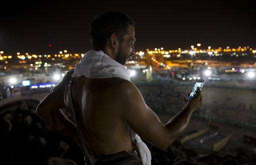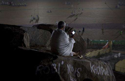 A Muslim pilgrim uses his mobile phone, while standing on top of the Jabal Al Rahma holy mountain, or the mountain of forgiveness, upon his arrival to Arafat for the annual hajj pilgrimage, outside the holy city of Mecca, Saudi Arabia, Wednesday, Aug. 30, 2017. (AP Photo/Khalil Hamra) The Associated Press