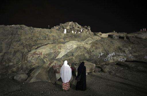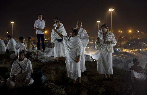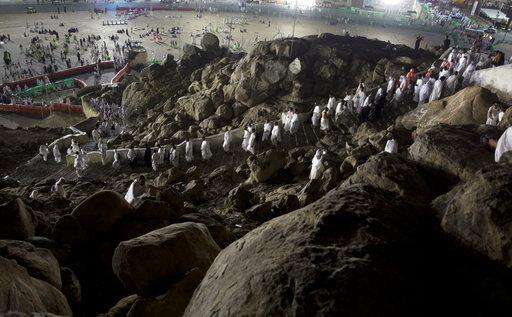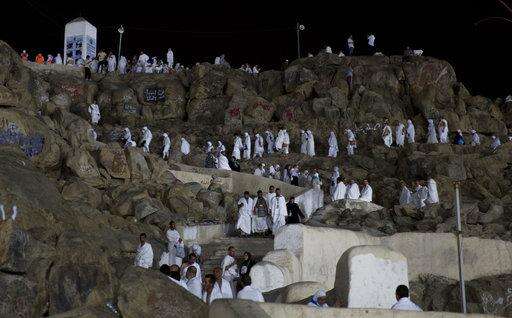 Muslim pilgrims visit the Jabal Al Rahma holy mountain, or the mountain of forgiveness, upon their arrival to Arafat for the annual hajj pilgrimage, outside the holy city of Mecca, Saudi Arabia, Wednesday, Aug. 30, 2017. (AP Photo/Khalil Hamra) The Associated Press