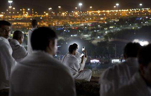 Muslim pilgrims take photos using their mobile phones, on top of the Jabal Al Rahma holy mountain, or the mountain of forgiveness, upon his arrival to Arafat for the annual hajj pilgrimage, outside the holy city of Mecca, Saudi Arabia, Wednesday, Aug. 30, 2017. (AP Photo/Khalil Hamra) The Associated Press
