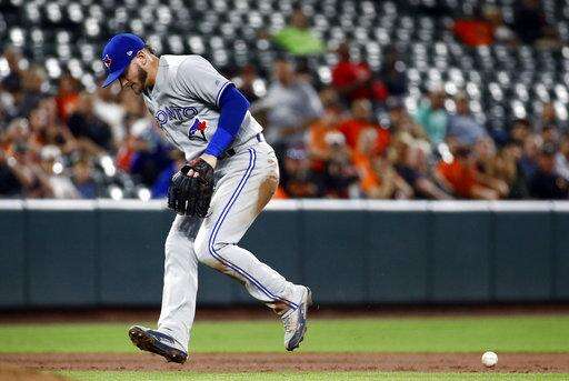 A ground ball-single by Baltimore Orioles' Tim Beckham slips past Toronto Blue Jays third baseman Josh Donaldson in the second inning of a baseball game in Baltimore, Thursday, Aug. 31, 2017. Chris Davis scored on the play. (AP Photo/Patrick Semansky) The Associated Press