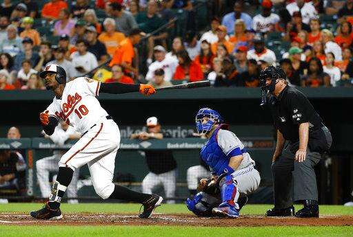 Baltimore Orioles' Adam Jones, left, watches his two-run home run in front of Toronto Blue Jays catcher Miguel Montero, center, and home plate umpire Gerry Davis in the first inning of a baseball game in Baltimore, Thursday, Aug. 31, 2017. (AP Photo/Patrick Semansky) The Associated Press