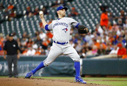 Toronto Blue Jays starting pitcher Marco Estrada throws to the Baltimore Orioles in the first inning of a baseball game in Baltimore, Thursday, Aug. 31, 2017. (AP Photo/Patrick Semansky) The Associated Press