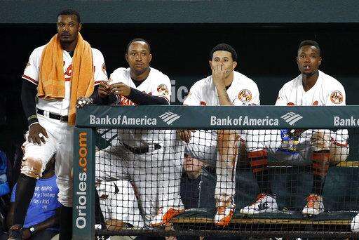 From left to right, Baltimore Orioles' Adam Jones, Jonathan Schoop, Manny Machado and Tim Beckham watch the ninth inning of a baseball game against the Toronto Blue Jays in Baltimore, Thursday, Aug. 31, 2017. (AP Photo/Patrick Semansky) The Associated Press