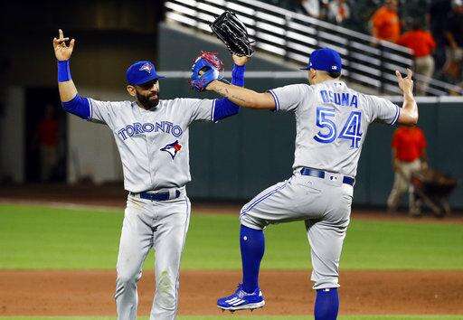 Toronto Blue Jays right fielder Jose Bautista, left, and relief pitcher Roberto Osuna celebrate after a baseball game against the Baltimore Orioles in Baltimore, Thursday, Aug. 31, 2017. (AP Photo/Patrick Semansky) The Associated Press