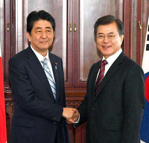 Japanese Prime Minister Shinzo Abe, left, and South Korean President Moon Jae-in shake hands before their bilateral meeting in Vladivostok, Russia Thursday, Sept. 7, 2017. (Hitoshi Takano/Kyodo News via AP)
