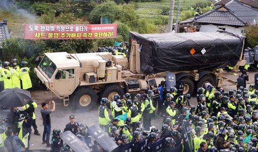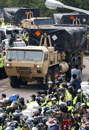 U.S. military vehicle moves as South Korean police officers try to block residents and protesters who oppose to deploy an advanced U.S. missile defense system called Terminal High-Altitude Area Defense, or THAAD, in Seongju, South Korea, Thursday, Sept. 7, 2017. Seoul's Defense Ministry on Thursday said the U.S. military has completed adding more launchers to a contentious U.S. missile-defense system in South Korea to better cope with North Korean threats. The deployment of the Terminal High-Altitude Area Defense system has angered North Korea but also China and Russia, which see the system's powerful radar as a threat to their own security. (Lee Sang-hak/Yonhap via AP)