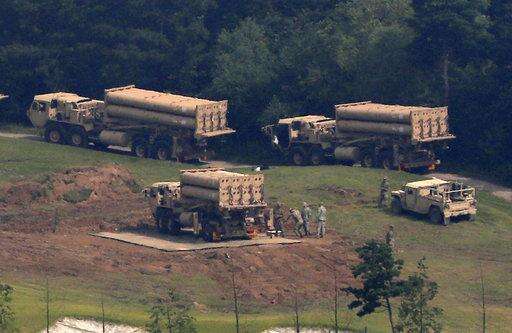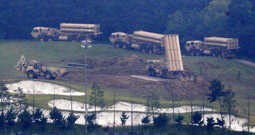 U.S. missile defense system called Terminal High-Altitude Area Defense system, or THAAD, are seen at a golf course in Seongju, South Korea, Thursday, Sept. 7, 2017. South Korea says the U.S. military has completed placing more launchers on the high-tech U.S. missile-defense system installed in the southeast to better cope against North Korean threats. The deployment of the THAAD system has angered North Korea but also China and Russia, which see the system's powerful radar as a threat to their own security. (Kim Jun-beom/Yonhap via AP)