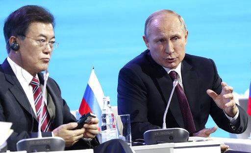 South Korea's President Moon Jae-in, left, listens as Russian President Vladimir Putin answers questions during a plenary session titled "The Russian Far East: Creating a New Reality" at the Eastern Economic Forum in Vladivostok, Russia, Thursday, Sept. 7, 2017. Russian President Putin says he believes President Donald Trump's administration is willing to defuse tensions on the Korean Peninsula. (Valery Sharifulin/TASS News Agency Pool Photo via AP)
