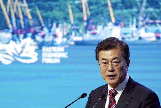 South Korea's President Moon Jae-in addresses a plenary session titled "The Russian Far East: Creating a New Reality" at the Eastern Economic Forum in Vladivostok, Russia, on Thursday, Sept. 7, 2017. Russian President Vladimir Putin says he believes President Donald Trump's administration is willing to defuse tensions on the Korean Peninsula. (Valery Sharifulin/TASS News Agency Pool Photo via AP)