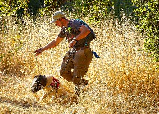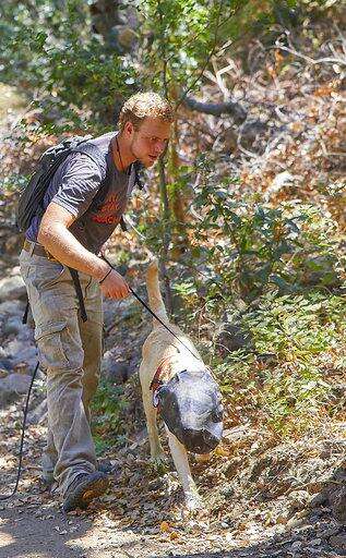 In this Aug. 10, 2017, provided by The Nature Conservancy photo shows Ky Zimmerman and his labrador Tobias search for nests of Argentine ants on Santa Cruz Island off the coast of Southern California. The dog is wearing a mask is to protect from foxtails, a grass seed that can get into his eyes, nose or mouth. Tobias searches for nests of the invasive species of ants that threatened the ecosystem after being introduced decades ago. (Gary Andrew/The Nature Conservancy via AP) The Associated Press