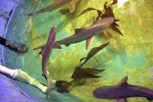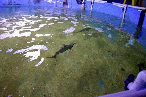 In this Aug. 23, 2017 photo provided by the New York State Department of Environmental Conservation, live sharks swim in a basement swimming pool in a LaGrangeville, N.Y. home. Officials say seven live sharks and three dead ones have been seized from the pool in the Hudson Valley home. (New York State Department of Environmental Conservation via AP) The Associated Press