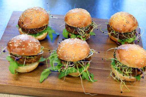 FILE - In this Aug. 14, 2017 file photo insect burgers are presented in Zurich, Switzerland. Swiss supermarket chain Coop, to a bit of hoopla, began selling “burgers” and “balls” made from insects. It’s billed as a first in Europe, a continent more accustomed to steak, sausage, poultry and fish as a source of protein rather than bugs that can be found in places like Africa or Asia. (Walter Bieri/Keystone via AP, file) The Associated Press
