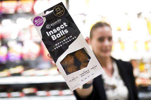 FILE - In this Aug. 21, 2017 file photo an employee of a Coop supermarket shows a packet of insect balls in Lugano, Switzerland. Swiss supermarket chain Coop, to a bit of hoopla, began selling “burgers” and “balls” made from insects. It’s billed as a first in Europe, a continent more accustomed to steak, sausage, poultry and fish as a source of protein rather than bugs that can be found in places like Africa or Asia. (Gabriele Putzu/Ti-Press/Keystone via AP, file) The Associated Press