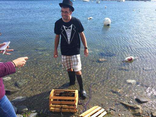 This Monday, Sept. 4, 2017, image provided by WLBZ shows part of a ceremony with Passey Pete the Lobster in Belfast, Maine. The lobster predicted six more weeks of summer at an annual ceremony. The crustacean has been fished out of the Passagassawakeag River for the past three years in a tradition modeled after famed groundhog Punxsutawney Phil's winter prediction in Pennsylvania. (Zach Blanchard/WLBZ via AP) The Associated Press