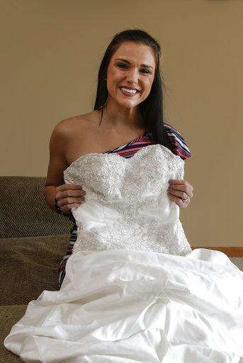 Dawnetta Heinz poses with her wedding dress in Omaha, Neb., Wednesday, Sept. 6, 2017. She has offered to share her wedding dress with brides on tight budgets. Two other women already have worn it in the past month, and there's interest from at least eight other women. (AP Photo/Nati Harnik) The Associated Press