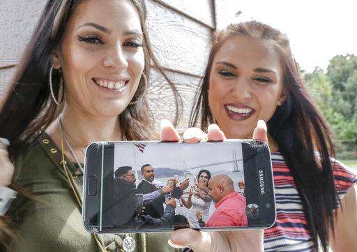 Arianna Pro, left, shows Dawnetta Heinz photos from her vow renewal ceremony in San Francisco, where she wore a wedding dress owned by Heinz, as they meet in Omaha, Neb., Wednesday, Sept. 6, 2017. Heinz has offered to share her wedding dress with brides on tight budgets. Two other women, including Arianna Pro have already worn the dress in the past month, and there's interest from several others. (AP Photo/Nati Harnik) The Associated Press