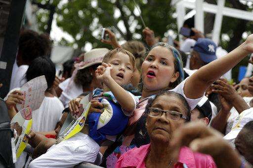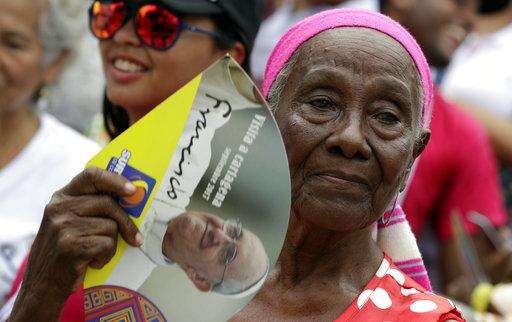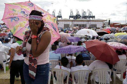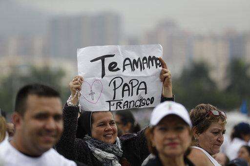 People wait for the arrival of Pope Francis to celebrate Mass in the area of the Contecar harbor in Cartagena, Colombia, Sunday, Sept. 10, 2017. (AP Photo/Andrew Medichini)