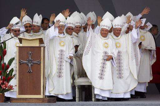 Priests wave from the stage where Pope Francis will celebrate Mass in Villavicencio, Colombia, Friday, Sept. 8, 2017. At an open-air Mass, Francis praised those who had resisted "the understandable temptation for vengeance" and instead sought out peace. (AP Photo/Ricardo Mazalan)