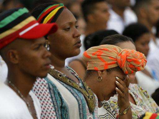 People attend Mass celebrated by Pope Francis at the seaport in Cartagena, Colombia, Sunday, Sept. 10, 2017. (AP Photo/Ricardo Mazalan)