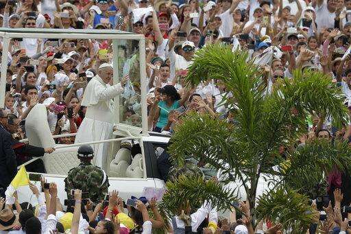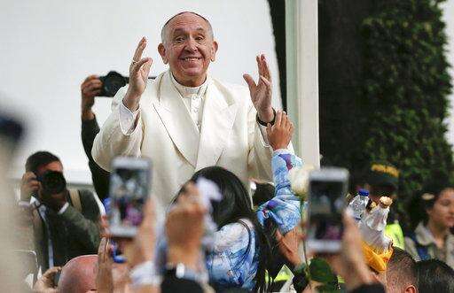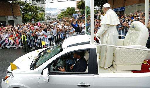 Pope Francis waves to the crowd from his popemobile as he arrives to celebrate Mass at a park in Villavicencio, Colombia, Friday, Sept. 8, 2017. (AP Photo/Andrew Medichini)