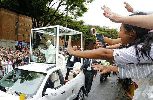 People wave to Pope Francis as he passes by in his popemobile in Medellin, Colombia, Saturday, Sept. 9, 2017. Francis flew to a rain-soaked Medellin on Saturday to console orphans, the poor and sick - and to demand priests and ordinary Colombians look beyond rigid church doctrine to care for sinners and welcome them in. (AP Photo/Fernando Vergara)