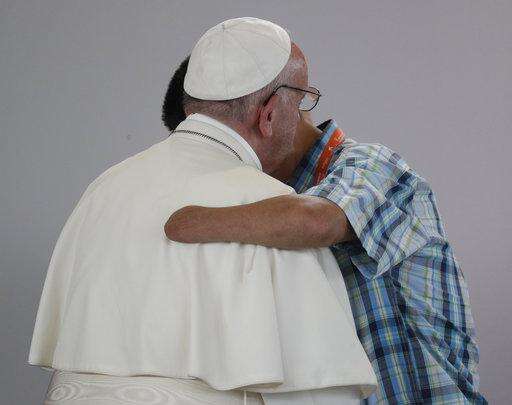 Former FARC rebel Carlos Juan Carlos Murcia, who lost his left hand, embraces Pope Francis during a prayer meeting for reconciliation at Las Malocas Park in Villavicencio, Colombia, Friday, Sept. 8, 2017. Pope Francis is visiting the area once besieged by leftist rebels for an event that brings victims and victimizers together. (AP Photo/Andrew Medichini)