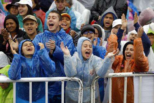 People cheer as they wait in the rain for Pope Francis to offer a giant outdoor Mass in Medellin, Colombia, Saturday, Sept. 9, 2017. (AP Photo/Fernando Vergara)