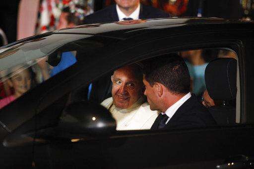 Pope Francis smiles at his driver as he arrives to the Nunciature at the end of his day of activities in Villavicencio, Colombia, Friday, Sept. 8, 2017. Francis has made reconciliation the central theme of his five-day trip after promising to visit the country upon the signing of last yearâs peace deal with the Revolutionary Armed Forces of Colombia, or FARC. (AP Photo/Ivan Valencia)