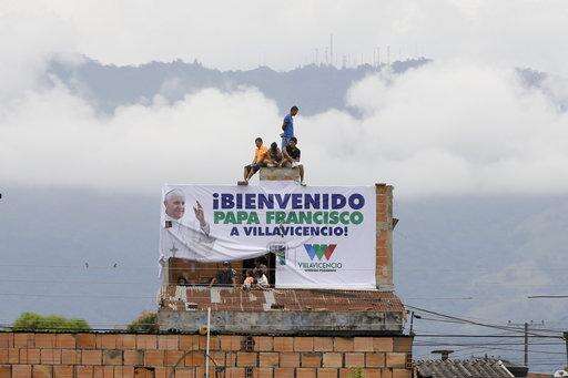 Residents sit on top of a home to get a better view of Pope Frances celebrating Mass at a park in Villavicencio, Colombia, Friday, Sept. 8, 2017. The sign reads in Spanish "Pope Francis, Welcome to Villavicencio!" (AP Photo/Ricardo Mazalan)