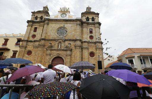 People waits for the arrival of Pope Francis outside the San Pedro Claver church in Cartagena, Colombia, Sunday, Sept. 10, 2017. Pope Francis arrived to Cartagena to honor St. Peter Claver, a 17th-century Jesuit who ministered to the tens of thousands of African slaves who arrived in the port to be sold. Francis returns to Rome on Sunday night.(AP Photo/Ricardo Mazalan) The Associated Press