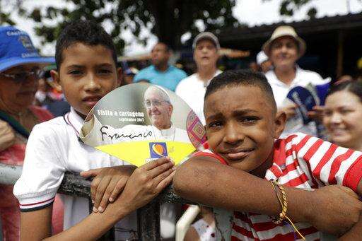 Two boys wait for the arrival of Pope Francis outside the San Pedro Claver church in Cartagena, Colombia, Sunday, Sept. 10, 2017. Pope Francis arrived to Cartagena to honor St. Peter Claver, a 17th-century Jesuit who ministered to the tens of thousands of African slaves who arrived in the port to be sold. Francis returns to Rome on Sunday night.(AP Photo/Ricardo Mazalan) The Associated Press
