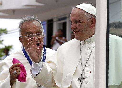 Pope Francis blesses people as he leaves the Nunciature on route to the Bogota airport on his last day in Colombia, Sunday, Sept., 10, 2017. Francis is heading to Cartagena to honor St. Peter Claver, a 17th-century Jesuit who ministered to the tens of thousands of African slaves who arrived in the port to be sold. Francis returns to Rome on Sunday night. (AP Photo/Ivan Valencia) The Associated Press