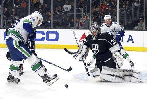 Vancouver Canucks center Markus Granlund (60) attacks as Los Angeles Kings goalie Jonathan Quick defends in the first period of an NHL preseason hockey game in Los Angeles Saturday, Sept. 16, 2017. (AP Photo/Reed Saxon)