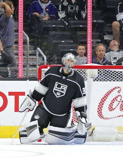 CORRECTS NAME TO DARCY KUEMPER- Los Angeles Kings goalie Darcy Kuemper sits in the goal after the Vancouver Canucks' Brock Boeser scored the winning goal in overtime in an NHL preseason hockey game in Los Angeles Saturday, Sept. 16, 2017. The Canucks won in overtime, 4-3. (AP Photo/Reed Saxon)