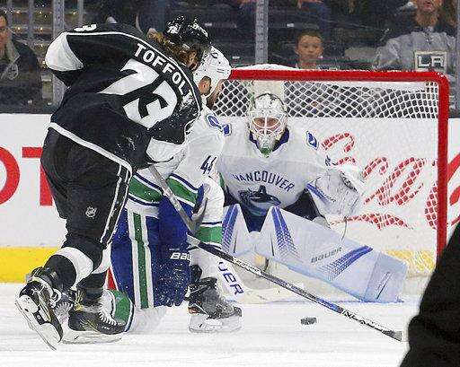 Vancouver Canucks goalie Jacob Markstrom defends as Los Angeles Kings center Tyler Toffoli attacks in the first period of an NHL preseason hockey game in Los Angeles Saturday, Sept. 16, 2017. (AP Photo/Reed Saxon)