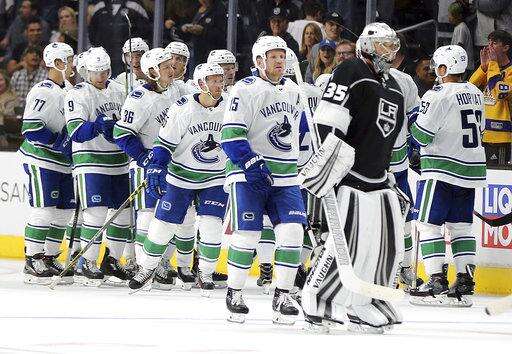 CORRECTS NAME TO DARCY KUEMPER-Los Angeles Kings goalie Darcy Kuemper walks past celebrating Vancouver Canucks after their goal in overtime gave them the win in an NHL preseason hockey game in Los Angeles Saturday, Sept. 16, 2017. The Canucks won in overtime, 4-3. (AP Photo/Reed Saxon)