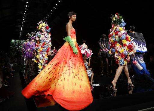 Models wear creations as part of the Moschino women's Fall/Winter 2018/19 fashion collection, presented in Milan, Italy, Thursday, Sept. 21, 2017. (AP Photo/Luca Bruno)