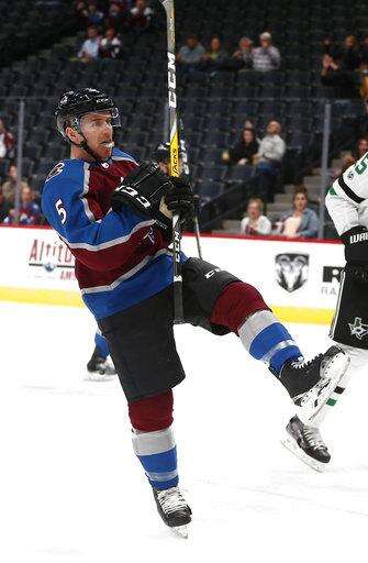 Colorado Avalanche defenseman David Warsofsky celebrates a goal against the Dallas Stars during the first period of a preseason NHL hockey game Thursday, Sept. 21, 2017, in Denver. (AP Photo/Jack Dempsey) The Associated Press