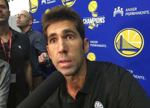 Golden State Warriors general manager Bob Myers takes questions from the media after NBA basketball practice in Oakland, Calif., Saturday, Sept. 23, 2017. President Donald Trump doubled down on denouncing protests by NFL players and rescinded NBA star Stephen Curry's White House invitation on Saturday, a series of tweets that quickly inflamed football and basketball stars and even prompted LeBron James to call the president a "bum." (AP Photo/Janie McCauley) The Associated Press