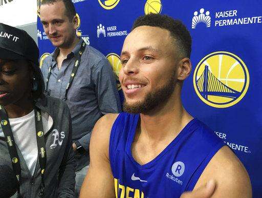 Golden State Warriors Stephen Curry takes questions from the media after NBA basketball practice in Oakland, Calif., Saturday, Sept. 23, 2017. President Donald Trump doubled down on denouncing protests by NFL players and rescinded NBA star Stephen Curry's White House invitation on Saturday, a series of tweets that quickly inflamed football and basketball stars and even prompted LeBron James to call the president a "bum." (AP Photo/Janie McCauley) The Associated Press